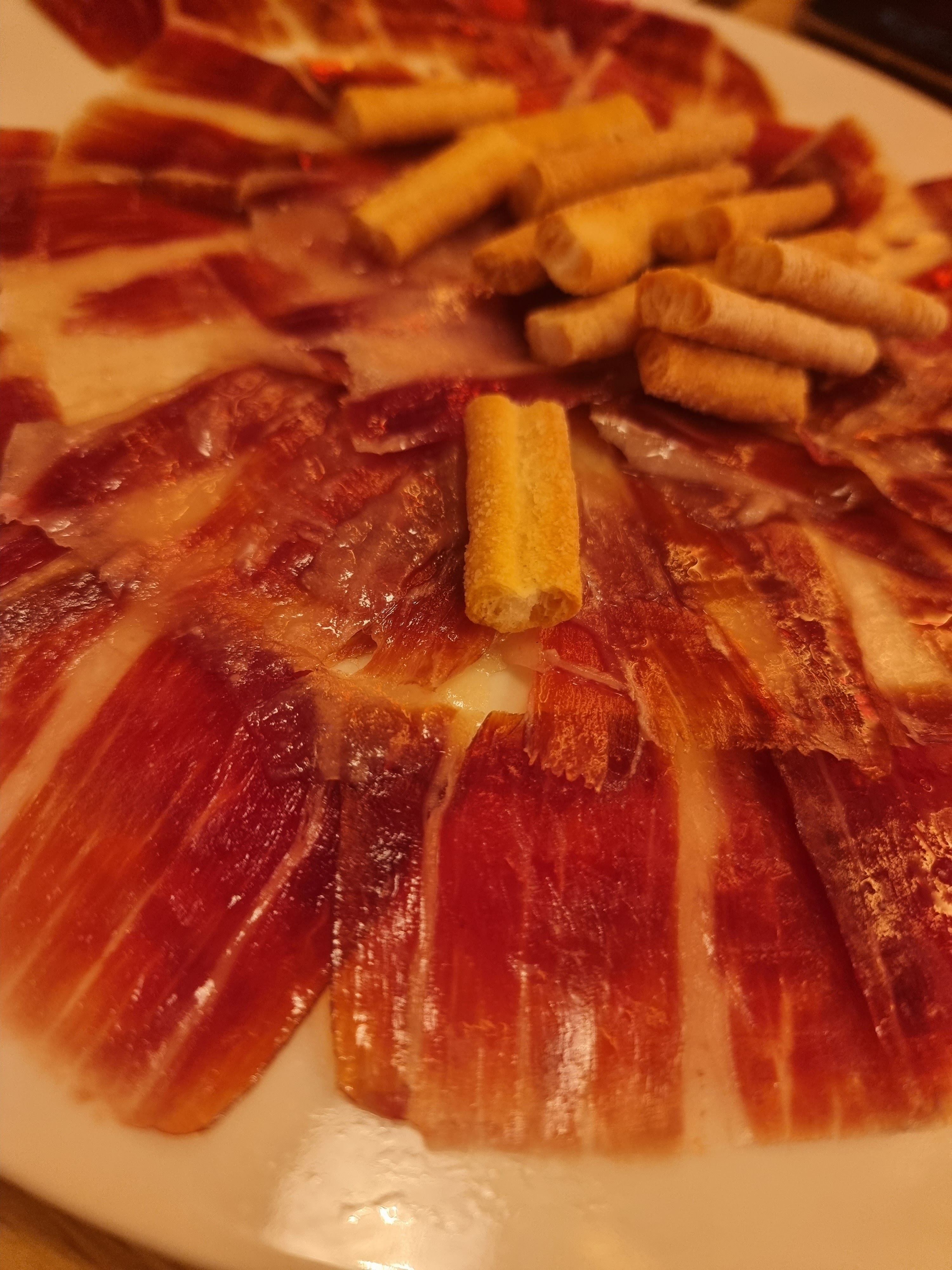 Je suis venu dîner avec ma famille un samedi soir, le quartier était bondé mais ce restaurant était caché dans une rue calme. Les gens ont commencé à arriver à 21 heures (comme il se doit). Nous avons partagé une grande tortilla qui était un délice (super crémeuse et bruine). Le jambon ibérique est un incontournable ainsi que les croquetas (très crémeuses et fondantes). Soyez conscient des prix, cependant, par rapport à l'Espagne, c'est au moins le double du prix.